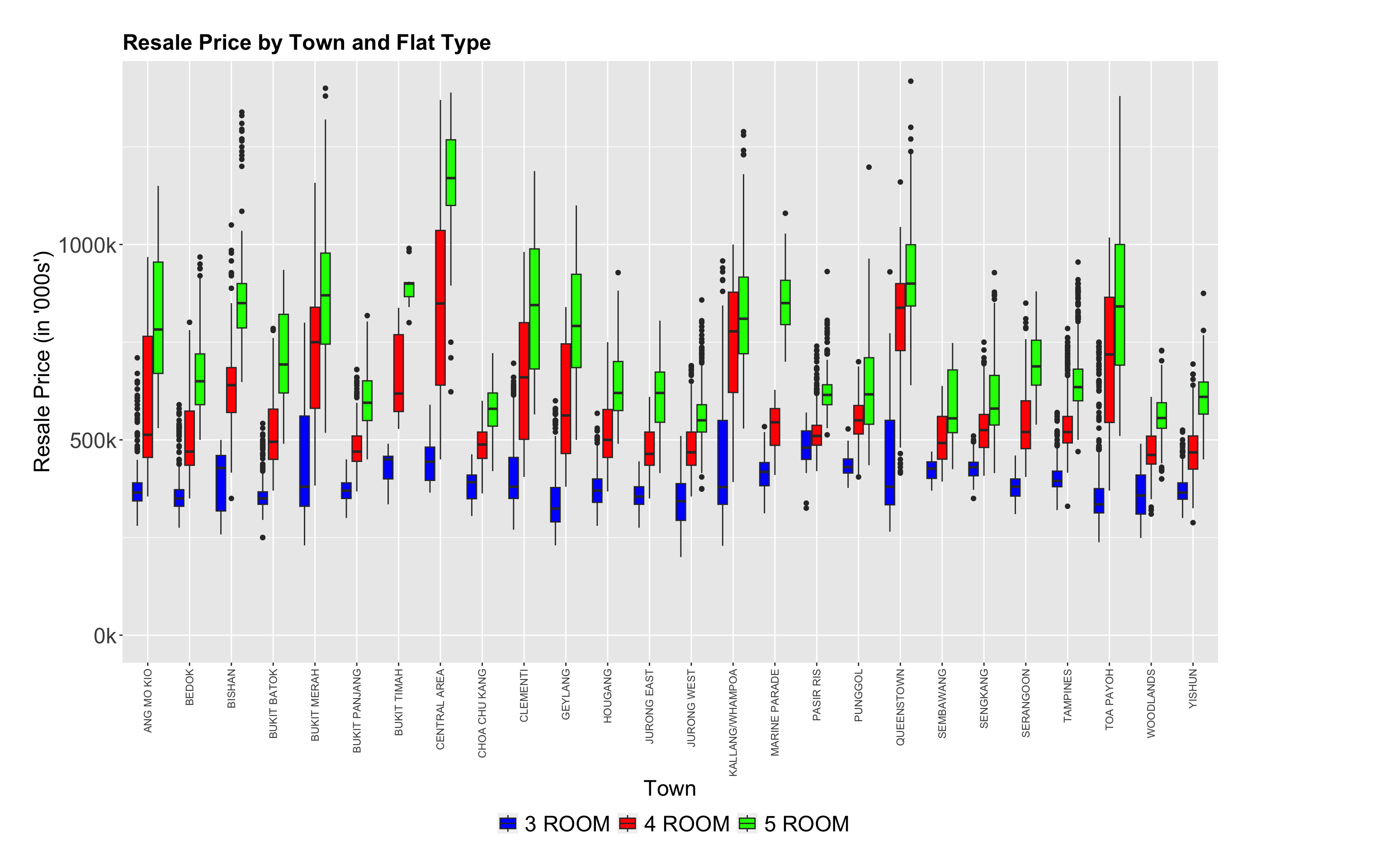 Insights: The chart shows the distribution of resale flat prices across different towns in Singapore, separated by flat type.