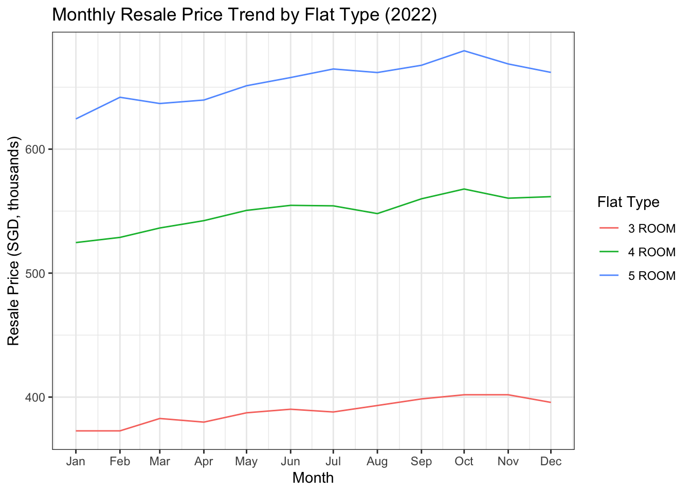 labs(x = "Month", y = "Resale Price (SGD, thousands)", color = "Flat Type",title = "Monthly Resale Price Trend by Flat Type (2022)") +